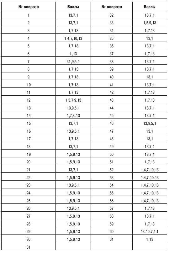 Если количество баллов не превышает 167, то с высокой вероятностью диагностируется выраженный тип поведенческой активности личности – тип А; 168–335 баллов – диагностируется определенная тенденция к поведенческой активности типа А (условно – А1); 336–459 – диагностируется промежуточный (переходный) тип личностной активности – тип АБ; 460–626 баллов – диагностируется определенная тенденция к поведенческой активности типа Б (условно – Б1); 627 баллов и выше – диагностируется с высокой вероятностью выраженный поведенческий тип личностной активности – тип Б.