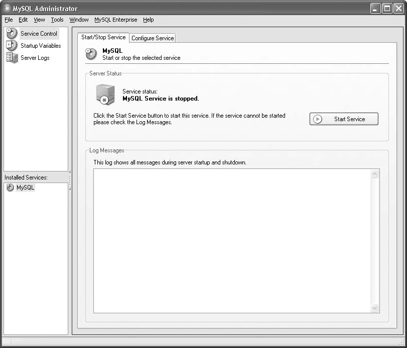 Для запуска и остановки сервера MySQL можно также использовать графическую утилиту MySQL Administrator.