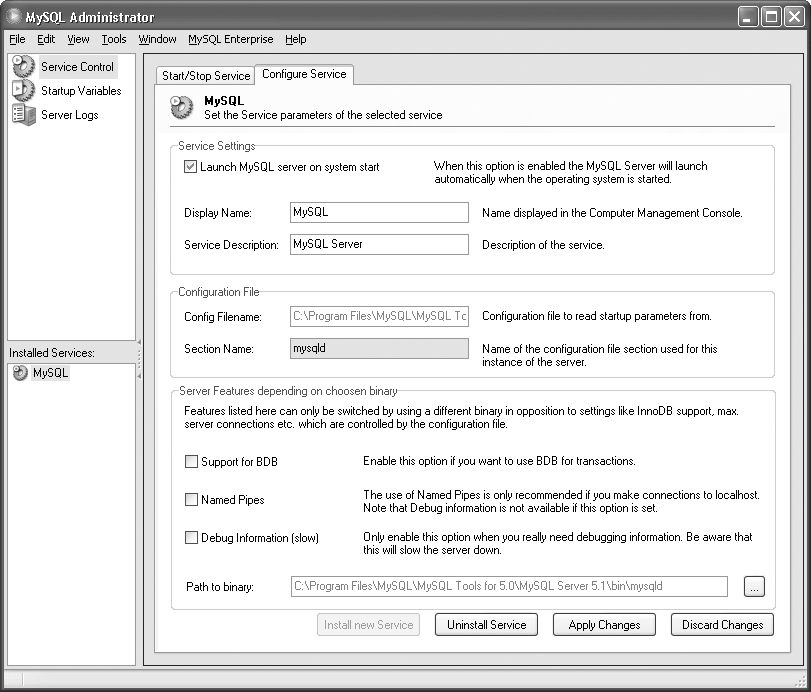 Рис. 1.28. Закладка Configure Service 5. Нажмите кнопку Start Service (Запустить сервис). Сервер MySQL будет запущен.