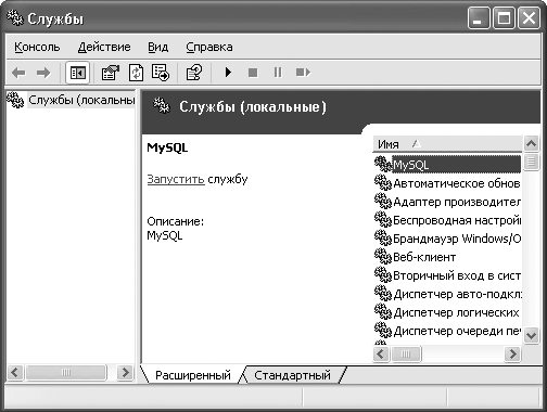 Если сервер MySQL был сконфигурирован как сервис Windows с помощью мастера настройки (см. подраздел «Настройка сервера MySQL») или с помощью утилиты MySQL Administrator (см. подраздел «Запуск и остановка сервера MySQL с помощью MySQL Administrator»), то запускать и останавливать его можно с помощью компонента Службы панели управления.