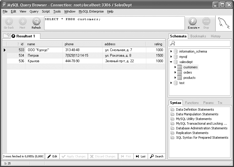 В обеих утилитах доступны все операции с данными. В MySQL Query Browser удобно работать с базой данных: ее компоненты наглядно представлены, можно непосредственно редактировать данные (без использования SQL-оператора UPDATE), работать с запросами, например строить их с помощью специального инструмента (при этом названия таблиц и столбцов вводить вручную не нужно), сохранять запросы в файле, экспортировать результаты запросов и многое другое. Вы можете узнать о всех возможностях MySQL Query Browser, обратившись к документации на русском языке, найти которую можно по ссылке http://dev.mysql.com/doc/query-browser/ru/index.html.