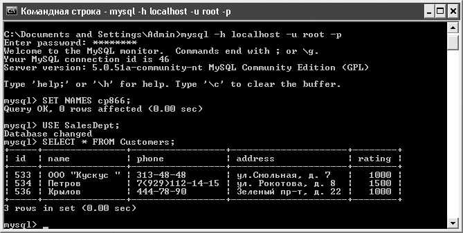 Рис. 2.2. Выполнение SQL-запроса в командной строке