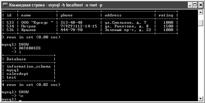 Утилита mysql позволяет вводить и многострочные команды (на рис. 2.3 таким образом введена команда SHOW DATABASES). Если не введена точка с запятой – признак конца команды, то при нажатии клавиши Enter утилита не отправляет команду на сервер, а предлагает продолжить ввод команды. Если вы хотите отменить ввод многострочной команды, наберите \c (рис. 2.3).