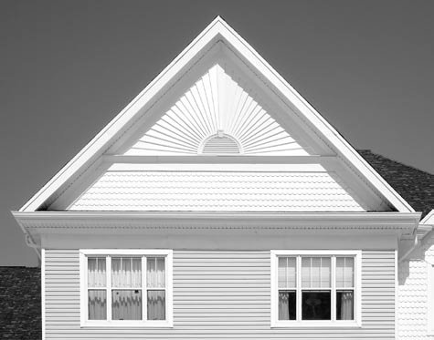 Рис. 1. Хозяева этого дома решили использовать сразу несколько видов сайдинга: горизонтальный – на стенах, цокольный типа «чешуя» – на фронтоне крыши, а завершает композицию декоративное «солнышко»