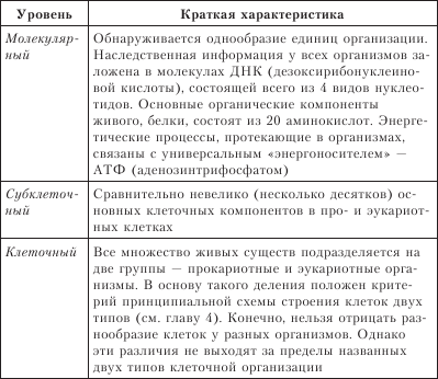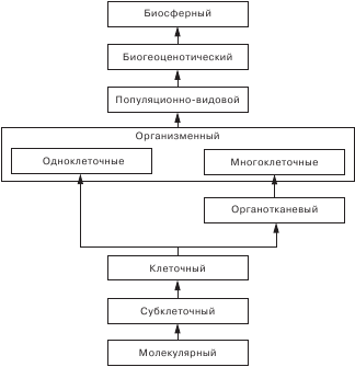 Существование жизни на всех уровнях обеспечивается структурой низшего ранга. Например, характер клеточного уровня организации определяется субклеточным и молекулярным уровнями; организменный – органным; тканевым, клеточным; видовой – организменным и т. д.