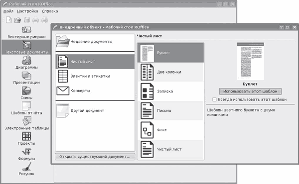 Вернемся к офису. Вызвать нужное приложение для работы можно как по отдельности, так и используя Рабочий стол KOffice (консольная команда koshell, рис. 2.5), с помощью которого можно выбирать приложения и переключаться между ними. При вызове любого компонента открывается окно мастера, помогающего выбрать шаблон, при необходимости можно сразу указать, какой шаблон использовать по умолчанию.