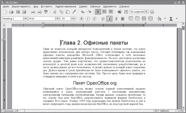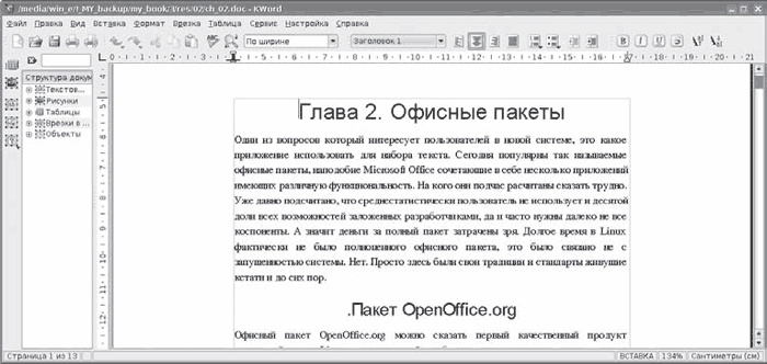 Полноценный тестовый процессор KWord (рис. 2.6) распознает не только свой собственный формат ODT (разработан в соответствии со стандартом OpenDocument ISO 26300), но и документы форматов HTML, RTF, обычный текстовый формат и документы Microsoft Word.