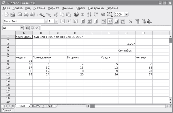 В качестве редактора электронных таблиц в пакете KOffice выступает KSpread (рис. 2.7). В нем поддерживается импорт из Microsoft Excel, таблиц Quattro Pro, GNUmeric, текстовых файлов, Applix Spreadsheets и других. Запись возможна как в свой формат, так и в текстовый, HTML и GNUmeric.