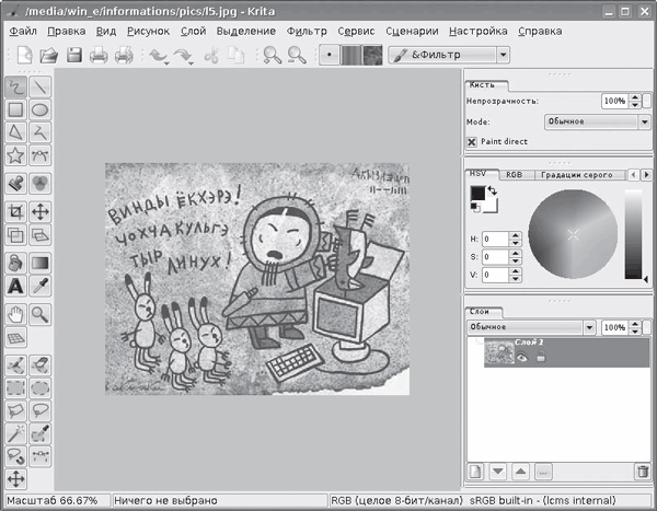 Растровый редактор Krita (рис. 2.9) появился в составе KOffice не сразу. Начало разработок относится к 1999 году, а в состав пакета он включен начиная с версии 1.4. Поддерживает различные системы цветности – RGB, CMYK и некоторые другие с 8, 16 и в некоторых случаях 32 бит на канал. Реализован импорт необработанных изображений RAW, сохранение результата в форматах TIFF, PNG, JPEG плюс собственный KRA. Поддержка остальных форматов возможна с использованием дополнительного плагина к GraphicsMagick. Имеются все привычные инструменты, позволяющие нарисовать любое изображение, поддерживается работа со слоями, как и в случае с Karbon, любой документ KOffice может быть вставлен как слой Krita, в наличии большое количество самых разнообразных фильтров. При необходимости обработать группу изображений есть возможность запуска сценариев, написанных на языках Python или Ruby.