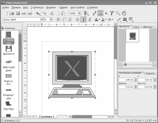 С помощью Kivio (рис. 2.12) можно создавать только простейшие схемы, так как в комплекте не так много наборов объектов (по сравнению с платным Visio). Используя имеющиеся в его составе объекты, можно рисовать схемы сетей, блоксхемы, диаграмы организации и некоторые другие.