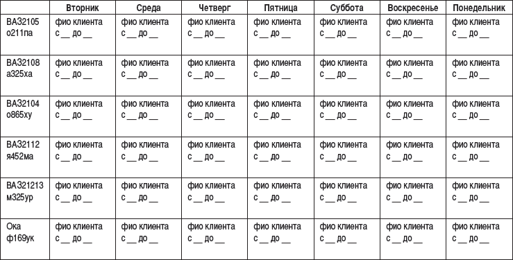 • диспетчерская сводка – заполняется службой приема заказов. По сводке должно быть видно, когда и какие из прокатных автомобилей свободны или заняты. Она имеет особую важность при оформлении предварительных заявок, поскольку позволяет предложить, зарезервировать и гарантировать клиенту аренду автомобиля;