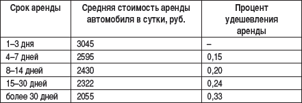 Как видно из таблицы, приведенной выше, среднерыночная стоимость аренды одного автомобиля снижается нелинейно, наибольшее снижение цены происходит при аренде либо на 4–7 дней, либо на срок более 30 дней.