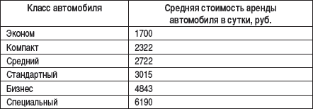 Средняя стоимость аренды автомобилей различных классов на сутки[6]