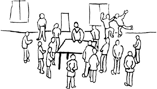 28. Эти люди стоят вокруг стола и один из них что-то объясняет. Ты находишься среди тех, которые слушают. Обозначь, где ты.