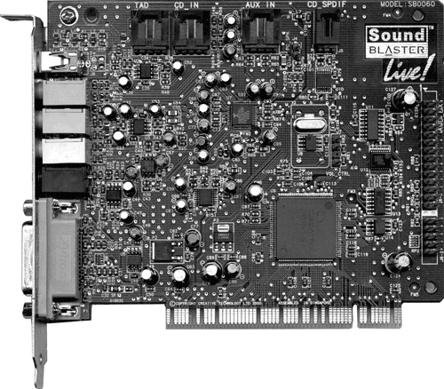 Звуковая карта (рис. 1.5) превращает цифровой образ звука в электрические колебания, которые затем выводятся на колонки или наушники и услаждают ваш слух.