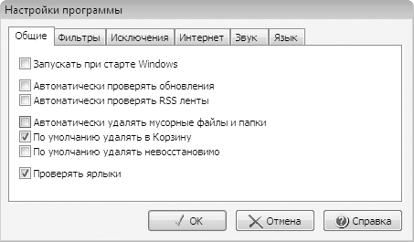 В результате откроется окно (рис. 2.12), в котором можно настроить способ удаления отмеченных объектов, расширения файлов, списки исключений, обновление программы и многое другое.