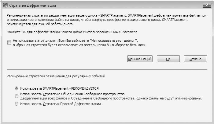 Перед началом дефрагментации нужно указать ее стратегию (рис. 2.15). Программа позволяет произвести простую дефрагментацию и «умную», которую, судя по названию (SMARTPlacement), можно назвать стратегией планирования. Утилита рекомендует выбрать именно ее, поскольку это позволяет оптимизировать файлы, основываясь на частоте доступа к ним, что должно заметно повысить скорость дисковой подсистемы. Кроме того, скорость SMARTPlacement примерно в два раза выше скорости простой дефрагментации.