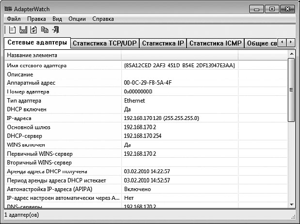 Если вам необходимо узнать характеристики сетевой карты, обратите внимание на программу AdapterWatch (рис. 1.1). Она не требует установки и при этом предоставит полную информацию о текущих настройках вашей сетевой карты, IP/WINS-адресах и DNS используемого сервера, а также полную статистику по всем имеющимся протоколам передачи данных (TCP, IP, UDP и ICMP). Кроме того, в AdapterWatch предусмотрена возможность подсчета трафика.