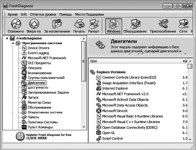 FreshDiagnose имеет интуитивно понятный интерфейс (рис. 1.2). В левой части окна программы расположены разделы, по которым производится анализ.