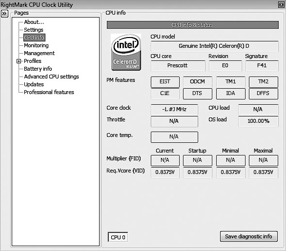 Данные о частоте и загрузке процессора отображаются в виде графика. Всю полученную информацию можно сохранить в текстовый файл. Кроме того, программа позволяет управлять режимом электропотребления, если процессор поддерживает эту функцию.