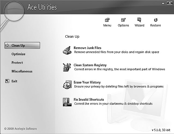 Группа Clean Up (Очистка) имеет четыре модуля. Первый, Remove Junk Files (Удаление ненужных файлов), предназначен для удаления файлов различных типов, которые не используются или устарели. Модули Clean System Registry (Очистка реестра) и Fix Invalid Shortcuts (Удалить некорректные ярлыки) предназначены соответственно для удаления неиспользуемых значений в системном реестре и недействительных ярлыков. Наконец, утилита Erase Your History (Удалить ненужные файлы) поможет избавиться от всех категорий файлов, которые остаются после работы различных приложений.