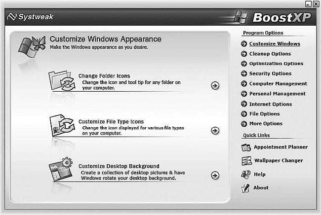Рассмотрим некоторые средства для настройки системы, имеющиеся в программе. Группа параметров Customize Windows (Настройка окон) включает в себя инструменты, которые позволяют настроить внешний вид Рабочего стола, значков папок и ярлыков. Группа Optimization Options (Параметры оптимизации) содержит инструмент для тонкой настройки оперативной памяти, менеджер запущенных процессов, а также позволяет быстро удалить установленные приложения и т. д. С помощью настроек группы Security Options (Параметры защиты) можно установить запрет запуска определенных приложений, исключить некоторые пункты из меню Пуск, ограничить доступ к настройкам интернет-браузера и т. д. Группа Internet Options (Параметры Интернета) позволяет настроить браузер Internet Explorer. С помощью инструментов для работы с кэшем браузера и статистикой посещенных ресурсов можно удалить записи из системы, скрыв тем самым следы своей работы в Интернете. Один из полезных инструментов группы File Options (Параметры файлов) позволяет разбить файл на меньшие части, что бывает очень важно, если требуется записать на носитель файл слишком большого размера. Другим не менее полезным инструментом является утилита для восстановления поврежденных ZIP-архивов.