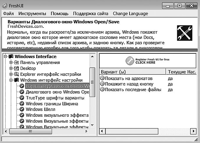Программа FreshUI предназначена для конфигурирования и оптимизации работы операционной системы Windows. С ее помощью вы можете настроить интерфейс Windows, параметры системы и запуска различных приложений, а также изменить профили аппаратной конфигурации для различных пользователей. FreshUI позволяет изменить около 100 скрытых параметров и установок Windows. Средства их настройки содержатся в соответствующих разделах: Applications (Приложения), Windows Explorer (Проводник Windows), Hardware (Оборудование), Windows Interface (Интерфейс Windows) и Windows System (Система Windows).