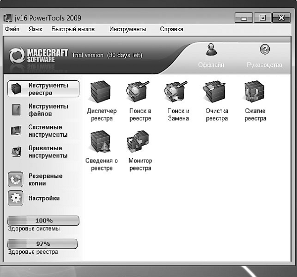 Программа jv16 PowerTools 2009 (рис. 1.8) – это одна из самых популярных утилит для оптимизации системы. Программа имеет два основных предназначения: управления файлами и работы с системным реестром. jv16 PowerTools 2009 поддерживает русский интерфейс и содержит большое количество поясняющих надписей к каждому инструменту программы, что очень упрощает работу с ней.