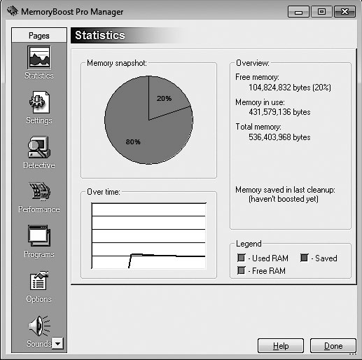 Утилита MemoryBoost Pro обладает расширенными возможностями улучшения работы оперативной памяти. Данная программа содержит оптимизирующие модули, позволяющие эффективно работать с физической памятью компьютера. Каждый модуль программы имеет отдельное окно с визуальным отображением настраиваемых параметров. Состояние системы показано с помощью диаграмм (рис. 1.9).