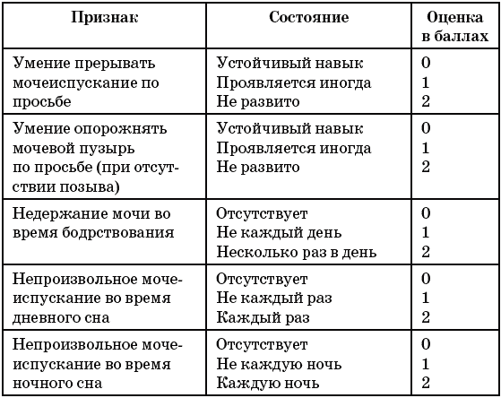 Оценить степень зрелости функции мочеиспускания поможет табл. 6, помещенная ниже. Она разработана группой авторов под руководством Е. Л. Вишневского. По сумме баллов можно судить о степени отклонения от нормы. Сумма, равная нулю, соответствует зрелому типу мочеиспускания.