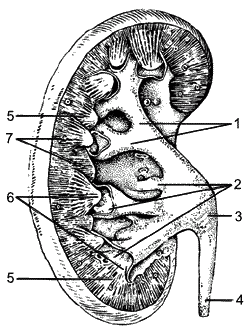 Рис. 4. Строение почки: 1 – большие чашечки; 2 – маленькие чашечки; 3 – лоханка; 4 – мочеточник; 5 – мозговое вещество почки; 6 – сосочки; 7 – корковое вещество почки