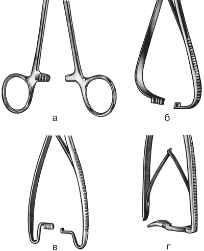 Рис. 1. Варианты расположения кремальер на рукоятках хирургических инструментов (по: Medicon Instruments,1986 [7]): а – на протяжении рукояток; б – на дугообразных концах рукояток; в – на S-образных пружинных пластинах; г – на торцах рукояток.