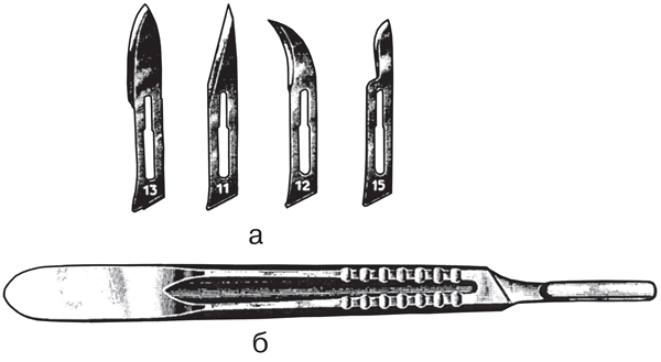 Рис. 3. Скальпель со съемным лезвием (по: Medicon Instruments, 1986 [7]): а – набор съемных лезвий; б – рукоятка скальпеля.