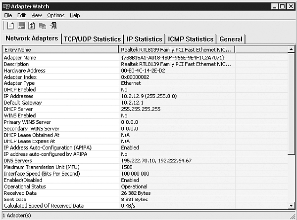 Если вам необходимо узнать характеристики сетевой карты, обратите внимание на программу AdapterWatch. Она не требует установки и при этом предоставит полную информацию о текущих настройках вашей сетевой карты, IP/WINS-адресах и DNS используемого сервера, а также полную статистику по всем имеющимся протоколам передачи данных (TCP, IP, UDP и ICMP). Кроме того, в AdapterWatch предусмотрена возможность подсчета трафика.