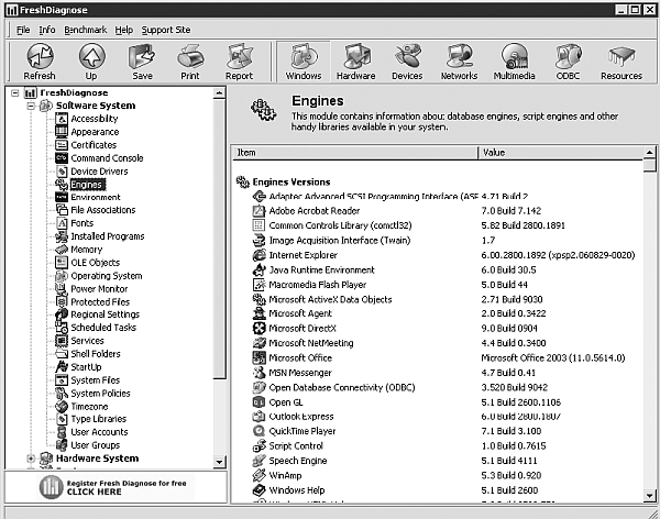 Разделы Software System и Hardware System позволяют получить максимально полную информацию об основных программных модулях, таких как операционная система, расширения файлов и ассоциированные с ними программы, системные папки и библиотеки, а также большое количество других дополнительных сведений. Раздел Hardware System изобилует информацией о BIOS, материнской плате, процессоре, кэш-памяти и имеющихся портах. Раздел Devices предоставляет сведения обо всех внешних подключенных устройствах: CD/DVD-приводах, манипуляторах, принтерах и т. д. Если ваш компьютер подключен к локальной сети или Интернету, то, выбрав раздел Network and Internet, вы узнаете об открытых сетевых ресурсах, настройках браузера Internet Explorer и параметрах доступа в Интернет. Кроме того, имеются разделы с информацией о различных мультимедиаустройствах и аппаратных ресурсах.