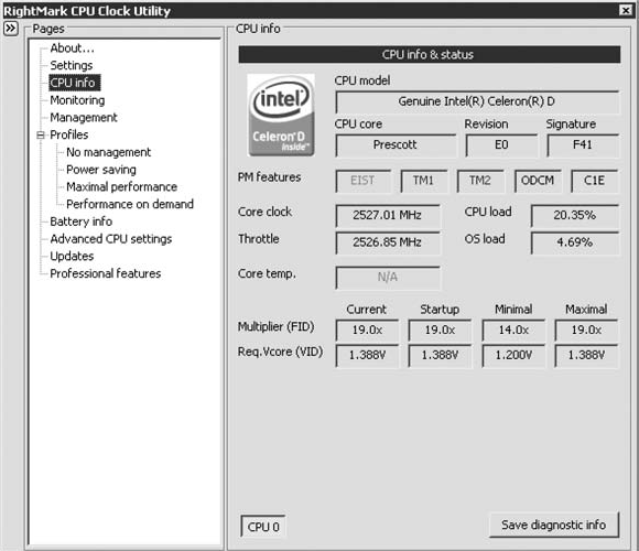 Частота и загрузка процессора отображаются в виде графика. Всю полученную информацию можно сохранить в текстовый файл. Кроме того, программа позволяет управлять режимом электропотребления, если процессор поддерживает эту функцию.