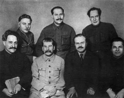 Орджоникидзе, Сталин, Молотов, Киров – сидят; Ворошилов, Каганович, Куйбышев – стоят.