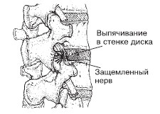 В-третьих, если диск продолжает испытывать нагрузки и его фиброзное кольцо прорывается в месте наибольшего напряжения, развивается грыжа межпозвоночного диска. Эти нарушения вызывают боль, особенно тогда, когда выдавленная часть диска начинает воздействовать на спинномозговой нерв (корешок) (рис. 1.2).