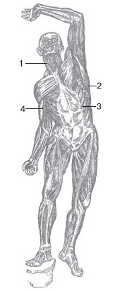 Рис. 2.3. Мышечная система человека: а – спереди: 1 — грудино-ключично-сосцевидная мышца; 2 – передняя зубчатая мышца; 3 — наружная косая мышца живота; 4 — двуглавая мышца;