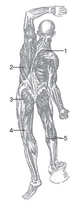 б – сзади: 1 — трапециевидная мышца; 2 – широчайшая мышца спины; 3 – большая ягодичная мышца; 4 — двуглавая мышца бедра; 5 – икроножная мышца