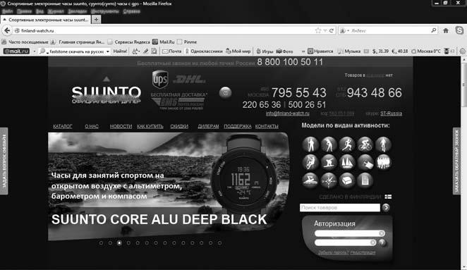 Заходим на сайт официального дилера наручных спортивных часов Suunto (www.finland-watch.ru) (рис. 6). В каталоге представлено немало различных спортивных направлений, для которых можно открыть интернет-магазин (туризм, фитнес, бег, велоспорт, дайвинг, скалолазание, сноубординг, яхтинг, плавание и пр.). При этом на данном сайте представлены только часы – в то время как каждый из перечисленных видов спорта подразумевает специфическое снаряжение! Рюкзаки, палки, шлемы, кроссовки, напульсники, кепки, специальные шорты, чтобы потеть или не потеть, лосины, велосипеды, гидрокостюмы, баллоны, маски, канаты, снаряжение для скалолазания, сноуборд, специальные очки, а также спортивное нижнее белье, обувь, средства гигиены и т. п. – можно сделать по интернет-магазину для каждого вида спорта, и отбоя от покупателей в ближайшие 20–30 лет не будет.