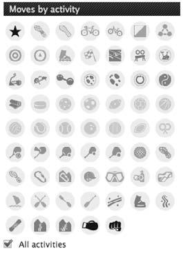 Давайте зайдем на сайт www.movescount.com (он сделан по типу социальной сети) – вы увидите большое количество значков (рис. 7). Если подвести мышку к значку, то на английском высветится, какой это вид спорта. На этом сайте представлена 61 «спортивная активность», и в каждой свои товары.