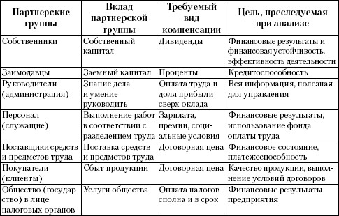 Субъектами экономического анализа являются юридические и физические лица, заинтересованные в получении информации о деятельности организации. Они представляют собой партнерские группы – пользователи информации о деятельности данной организации (табл. 1.1).