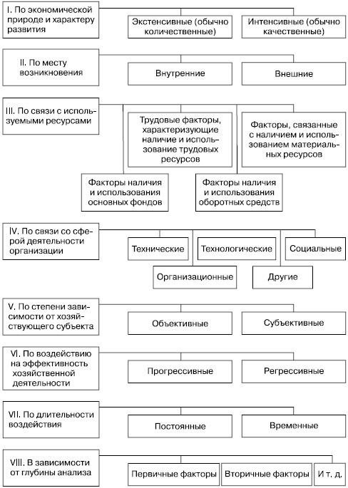 Под факторами понимаются условия протекания хозяйственных процессов или причины, вызвавшие их изменения. Единой научно обоснованной классификации факторов в экономическом анализе не выработано. Ниже приведена примерная классификация факторов по ряду признаков (рис. 2.2).