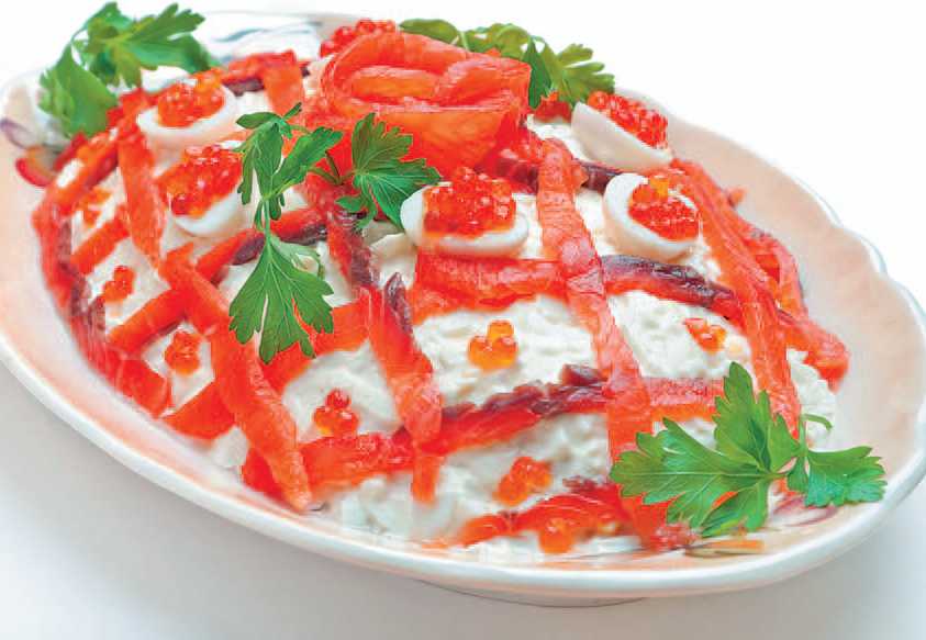Каперсы откинуть на сито, несколько раз встряхнуть и затем мелко нарезать. Чеснок, укроп и лук измельчить. Смешать эти ингредиенты и добавить майонез и горчицу, положить креветки и еще раз перемешать. Авокадо очистить, удалить косточку, нарезать тонкими полосками и сбрызнуть соком лимона. Яйца отварить вкрутую и разрезать на половинки. Желтки удалить, в белки положить икру. В центр блюда выложить горкой салат, сверху украсить его икрой форели, фаршированными икрой яйцами. Полосками копченой форели выложить узор, в центре поместить «розочку». Сверху положить веточки петрушки и кусочки авокадо.