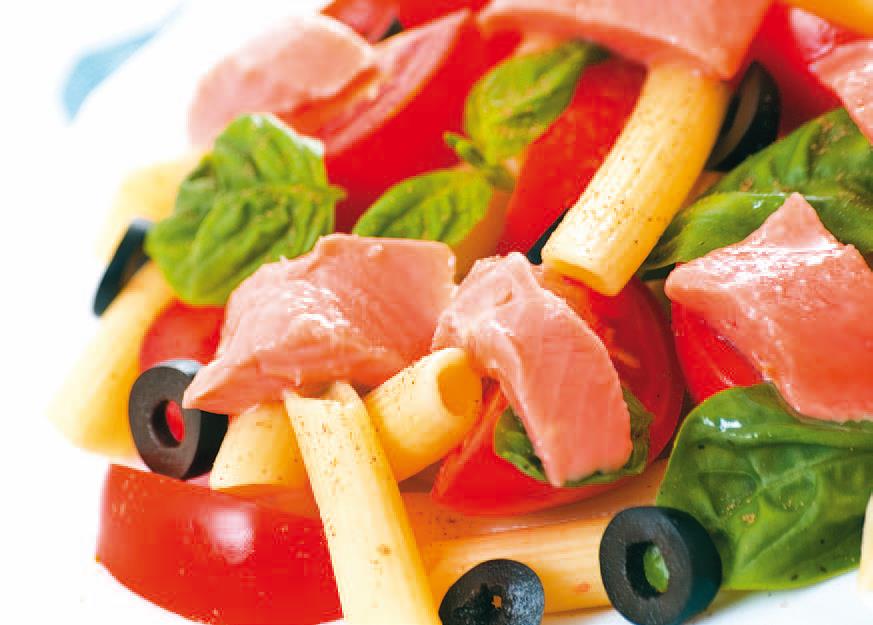 200 г макарон (ригатони), 200 г слабосоленой форели, 1 огурец, 1 помидор, 1 болгарский перец, 10 оливок без косточек, зелень укропа, соль по вкусу, 2 ст. ложки оливкового масла, 2 ч. ложки сока лимона, немного базилика.