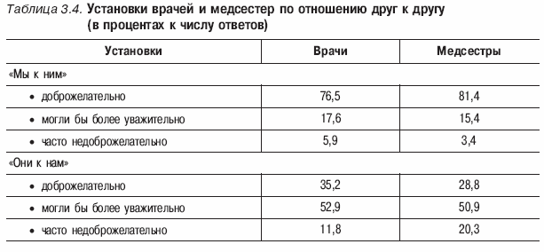 В одном из проведенных нами исследований на материале нескольких организаций изучались взаимоотношения двух категорий работников – медсестер и врачей. В контексте анализируемой проблемы уместно остановиться на следующих результатах. В целом мы имели дело с благополучными организациями. Опрошенные нами работники были довольны своей работой и не намеревались менять место работы. Взаимоотношения врачей и медсестер оценили как благоприятные 66,6 % врачей и 73,2 % медсестер. Помимо оценки взаимоотношений в целом опрашиваемым предлагалось раздельно оценить отношение врачей к медсестрам и медсестер к врачам. При этом предлагались следующие варианты ответа: «В целом врачи относятся к медсестрам доброжелательно, с пониманием трудностей их работы и их вклада в лечебный процесс»; «Врачи могли бы более уважительно относиться к труду медсестер и больше считаться с трудностями их работы»; «Врачи часто недоброжелательно относятся к медсестрам, пренебрежительно относятся к их работе». Вопрос об отношении медсестер к врачам имел тождественные закрытия. Результаты приведены в табл. 3.4.
