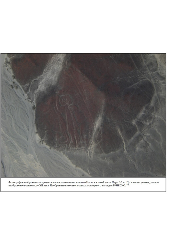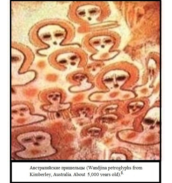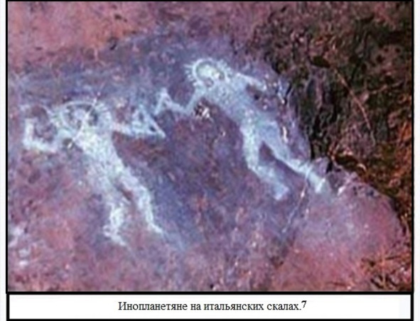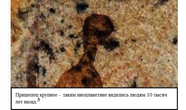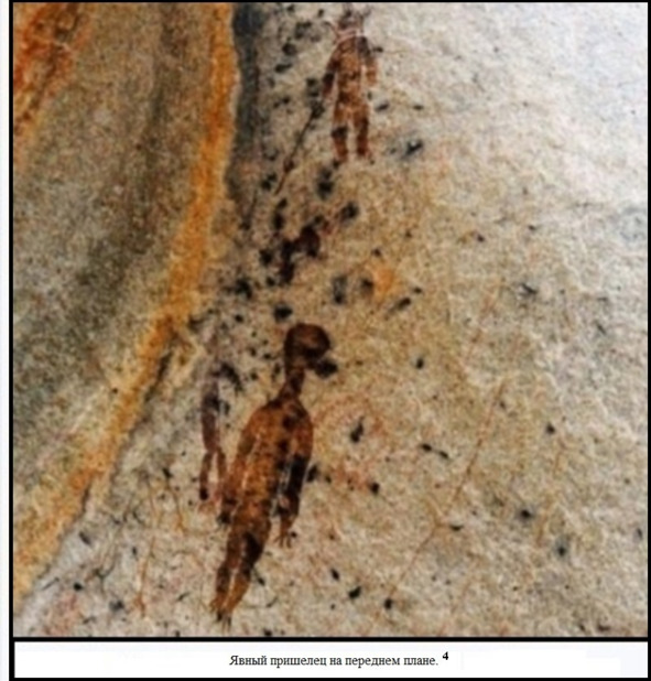Одним из доказательств посещения инопланетян Земли до нашей эры являются наскальные рисунки, обнаруженные в различных частях нашей планеты. О таких наскальных рисунках писала газета «Комсомольская правда» в статье «В Индии обнаружены древние наскальные изображения пришельцев и их летательного аппарата»69: «О находке сообщила индийская газета Times of India. Находятся наскальные рисунки, соответственно, в Индии – в штате Чхаттисгарх (Chhattisgarh) примерно в 130 километрах от города Райпур (Raipur). Их обнаружили в пещерах, которые тянутся под деревнями Чандели и Готитола (Chandeli and Gotitola). На рисунках фигуры. Но не люди, а какие-то гуманоиды. Некоторые – в скафандрах и с предметами, напоминающими оружие. Изображен и объект – на трех ногах-опорах, который можно принять за «летающую тарелку». Рисункам примерно 10 тысяч лет, как уверяют индийские археологи. Они и, конечно же, уфологи полагают, что древние художники изобразили инопланетян, прилетевших на Землю. Запечатлели момент их появления. Опять же, по данным индийских археологов, среди местных жителей распространена легенда, передаваемая из поколение в поколение: будто бы когда-то с небес сюда несколько раз спускались люди маленького роста – «рохела». И забирали с собой одного – двух селян. Обратно не возвращали. Власти штата относятся к находке крайне серьезно – верят, что на стенах пещер изображены пришельцы. Они – власти – намерены привлечь к изучению рисунков экспертов НАСА и Индийского национального космического агентства (ISRO). Кстати, наскальных рисунков, на которых энтузиасты углядывают пришельцев, полно. Например, вполне можно принять за инопланетян в скафандрах фигуры, изображенные в долине Камоника в Италии. Им тоже около 10 тысяч лет. А лица из Австралии – ну, вылитые инопланетные. Подобные картинки служат уфологам подтверждениями теории палеоконтакта – то есть, гипотезы о том, что нашу планету в глубокой древности посещали представители внеземного разума».