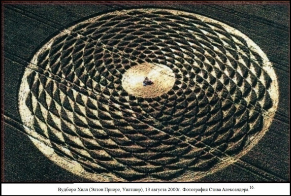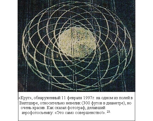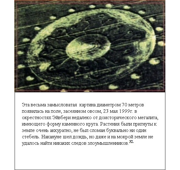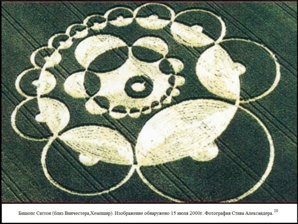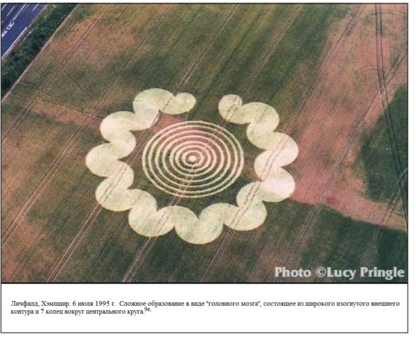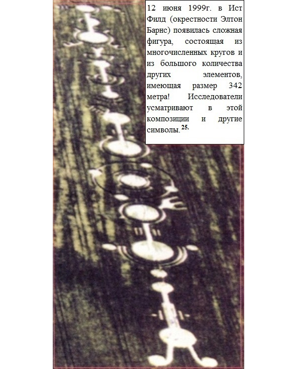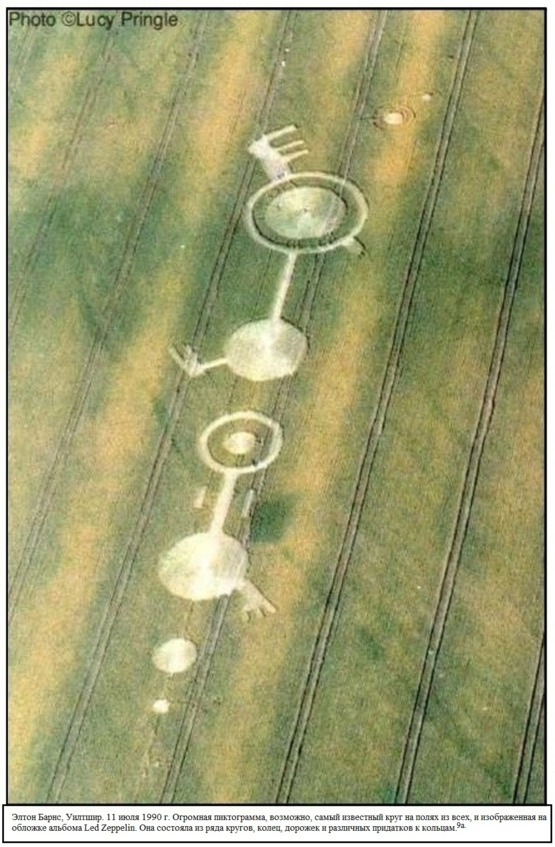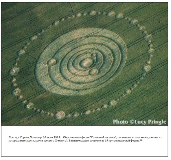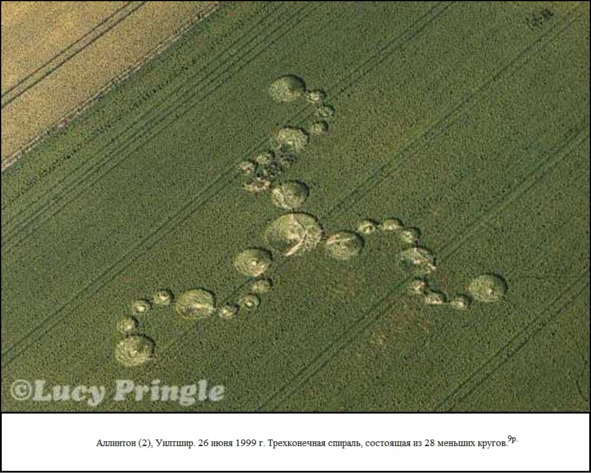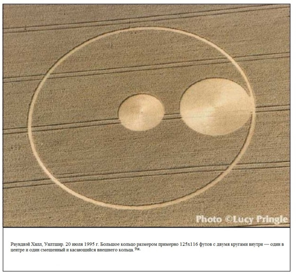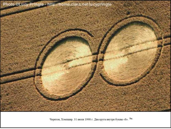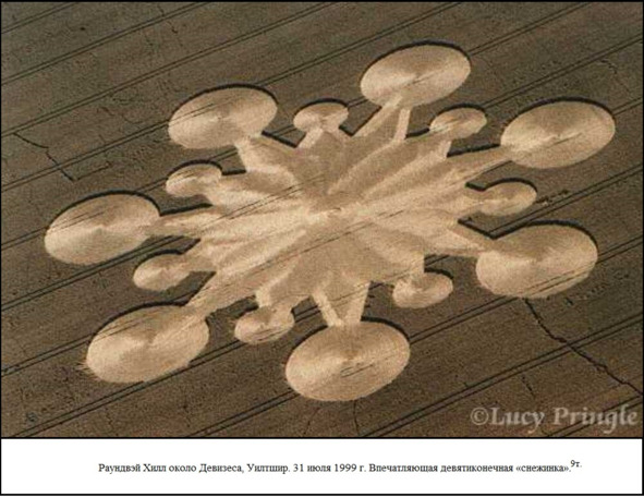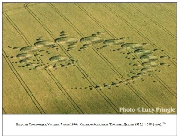 «круг» появляется за счет спирального движения энергии, идущего вслед за летящими объектам… Анализируя верхние данные самой видеопленки, т.е. знаки, которые на пленке видны, можно сделать выводы о том, что… данная пленка была выполнена без применения компьютера – Я полагаю, что нет такого аниматора, который бы смог создать такую пленку… Я не нахожу никаких следов фальсификации данных кадров». Другие независимые эксперты пришли к аналогичному выводу: на пленке зафиксировано реальное событие. Но вот проходит несколько лет и появляется сообщение, что данная видеозапись – фальшивка, к изготовлению которой причастен некий Джон Вейб – один из партнеров студии видеомонтажа и анимации «First Cut Studios» (Бристоль, Великобритания). Под давлением доказательств (а может, некоего давления?) Джон Вейб якобы признал, что видеозапись была подготовлена на студии. О том, как обстояло дело в действительности, общественность может строить только предположения…». Самым впечатляющим в феномене «кругов на полях» является то, что они бывают внушительных размеров. Так журнал «НЛО» опубликовал информацию об обнаружении кругов диаметром 50 м. и 100 м.! Вот эта статья журнала «НЛО» (№36 (507) от 03.09.2007г.): «Но, как прежде, сюрпризами чаще всего балует графство Уилтшир. Там еще 15 апреля 2007 года возле Оливерс-Касл на поле рапса нашли с воздуха – круг, пересеченный дугами. Диаметр круга – ровно 333 фута, то есть чуть больше сотни метров, ширина внешнего круга – 10 метров, ширина дуг примерно по 1,5 метра. Всего их семь. Высота стоящих стеблей – 1,2 метра. Примятые стебли не сломаны и продолжают расти в горизонтальном положении. Из-за того что пиктограмма возникла давно, легко можно было заметить отличия в цветках рапса – внутри круга растения были в полном цвету, тогда как на прилежащей территории уже почти все желтые цветочки осыпались или привяли, так что фон выглядел грязно-зеленым. Цереологи и раньше замечали, что если круг аутентичный (подлинный), а не рукотворный, то растения в его пределах цветут дольше – может быть, потому, что примятым стеблям приходится бороться за выживание. В Эбботс-Даун, тоже в Уилтшире, 5 июня 2007 года нашли удивительную пиктограмму, напоминающую объемное изображение глобуса с четырьмя параллелями и меридианами. В Милк-Хилл была обнаружена красивая, но странная 50-метровая пирамидальная формация, вписанная в окружность (с добавлением четырех малых кругов), как бы указывающая на знаменитую меловую Белую лошадь, что красуется на склоне холма. Однако одна из самых эффектных и загадочных пиктограмм появилась на ячменном поле в Истон-Ройял 12 июня 2007 года. По ее поводу, каких только предположений ни высказывалось! Кто-то считает, что она символизирует начало генезиса, или это схема ядерной реакции, или украшенный перьями головней убор индейца, или подсвечник, или некий циферблат. А кое-кто считает, что это древний 12-месячный мегалитический календарь».