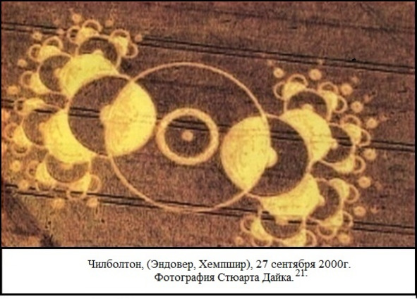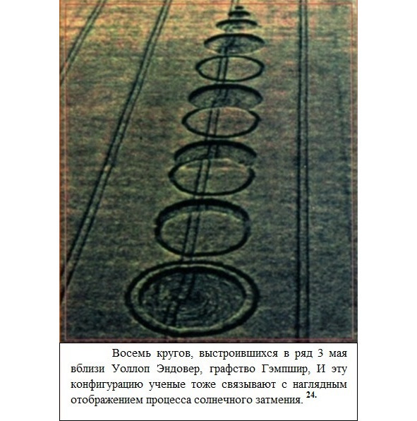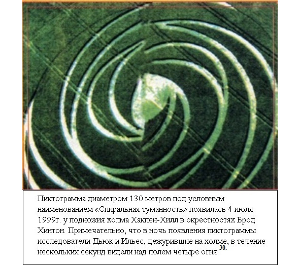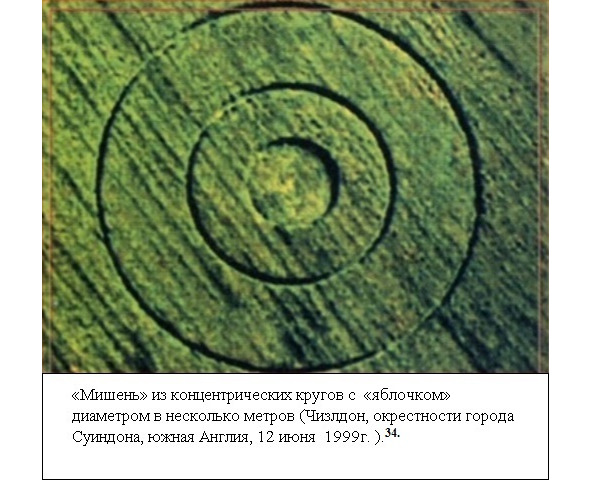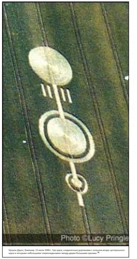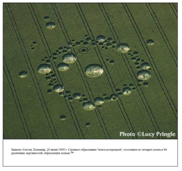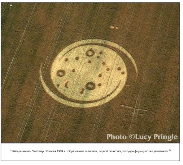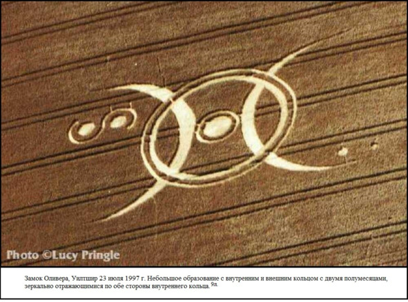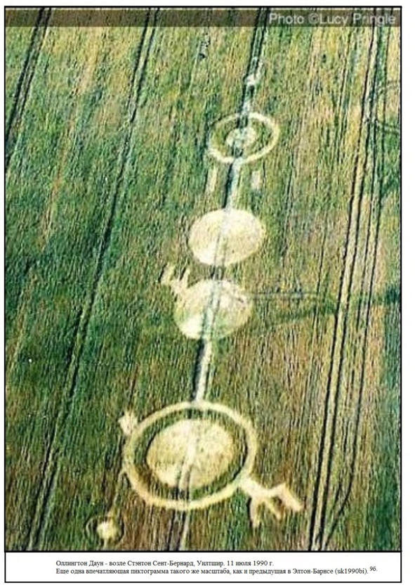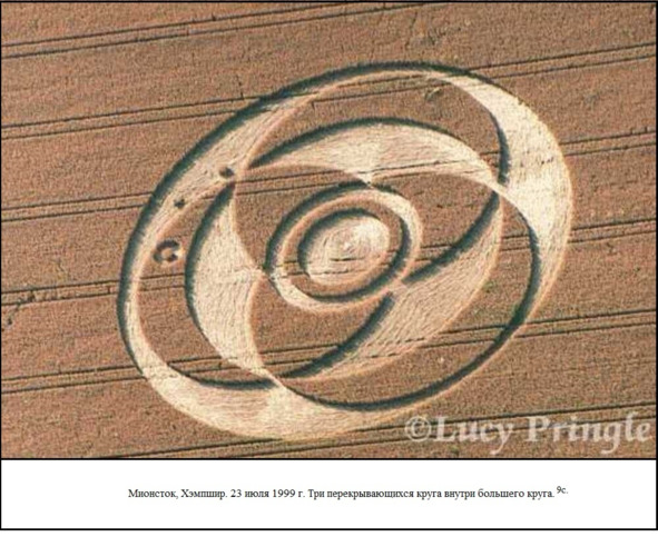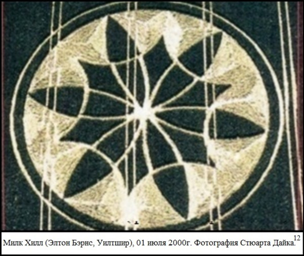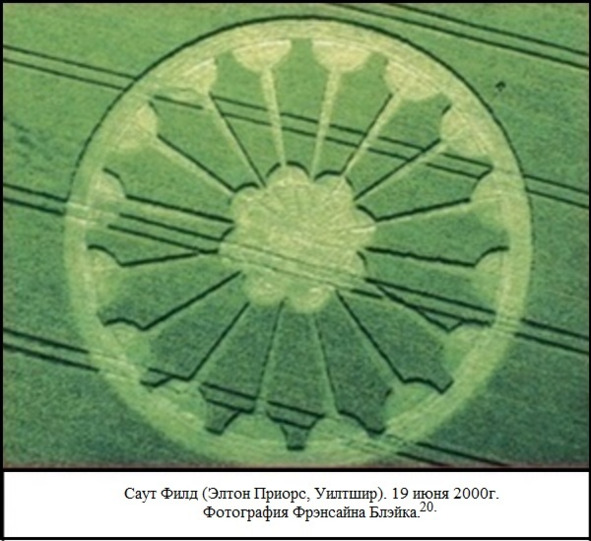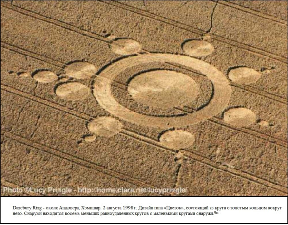 «круг» появляется за счет спирального движения энергии, идущего вслед за летящими объектам… Анализируя верхние данные самой видеопленки, т.е. знаки, которые на пленке видны, можно сделать выводы о том, что… данная пленка была выполнена без применения компьютера – Я полагаю, что нет такого аниматора, который бы смог создать такую пленку… Я не нахожу никаких следов фальсификации данных кадров». Другие независимые эксперты пришли к аналогичному выводу: на пленке зафиксировано реальное событие. Но вот проходит несколько лет и появляется сообщение, что данная видеозапись – фальшивка, к изготовлению которой причастен некий Джон Вейб – один из партнеров студии видеомонтажа и анимации «First Cut Studios» (Бристоль, Великобритания). Под давлением доказательств (а может, некоего давления?) Джон Вейб якобы признал, что видеозапись была подготовлена на студии. О том, как обстояло дело в действительности, общественность может строить только предположения…». Самым впечатляющим в феномене «кругов на полях» является то, что они бывают внушительных размеров. Так журнал «НЛО» опубликовал информацию об обнаружении кругов диаметром 50 м. и 100 м.! Вот эта статья журнала «НЛО» (№36 (507) от 03.09.2007г.): «Но, как прежде, сюрпризами чаще всего балует графство Уилтшир. Там еще 15 апреля 2007 года возле Оливерс-Касл на поле рапса нашли с воздуха – круг, пересеченный дугами. Диаметр круга – ровно 333 фута, то есть чуть больше сотни метров, ширина внешнего круга – 10 метров, ширина дуг примерно по 1,5 метра. Всего их семь. Высота стоящих стеблей – 1,2 метра. Примятые стебли не сломаны и продолжают расти в горизонтальном положении. Из-за того что пиктограмма возникла давно, легко можно было заметить отличия в цветках рапса – внутри круга растения были в полном цвету, тогда как на прилежащей территории уже почти все желтые цветочки осыпались или привяли, так что фон выглядел грязно-зеленым. Цереологи и раньше замечали, что если круг аутентичный (подлинный), а не рукотворный, то растения в его пределах цветут дольше – может быть, потому, что примятым стеблям приходится бороться за выживание. В Эбботс-Даун, тоже в Уилтшире, 5 июня 2007 года нашли удивительную пиктограмму, напоминающую объемное изображение глобуса с четырьмя параллелями и меридианами. В Милк-Хилл была обнаружена красивая, но странная 50-метровая пирамидальная формация, вписанная в окружность (с добавлением четырех малых кругов), как бы указывающая на знаменитую меловую Белую лошадь, что красуется на склоне холма. Однако одна из самых эффектных и загадочных пиктограмм появилась на ячменном поле в Истон-Ройял 12 июня 2007 года. По ее поводу, каких только предположений ни высказывалось! Кто-то считает, что она символизирует начало генезиса, или это схема ядерной реакции, или украшенный перьями головней убор индейца, или подсвечник, или некий циферблат. А кое-кто считает, что это древний 12-месячный мегалитический календарь».